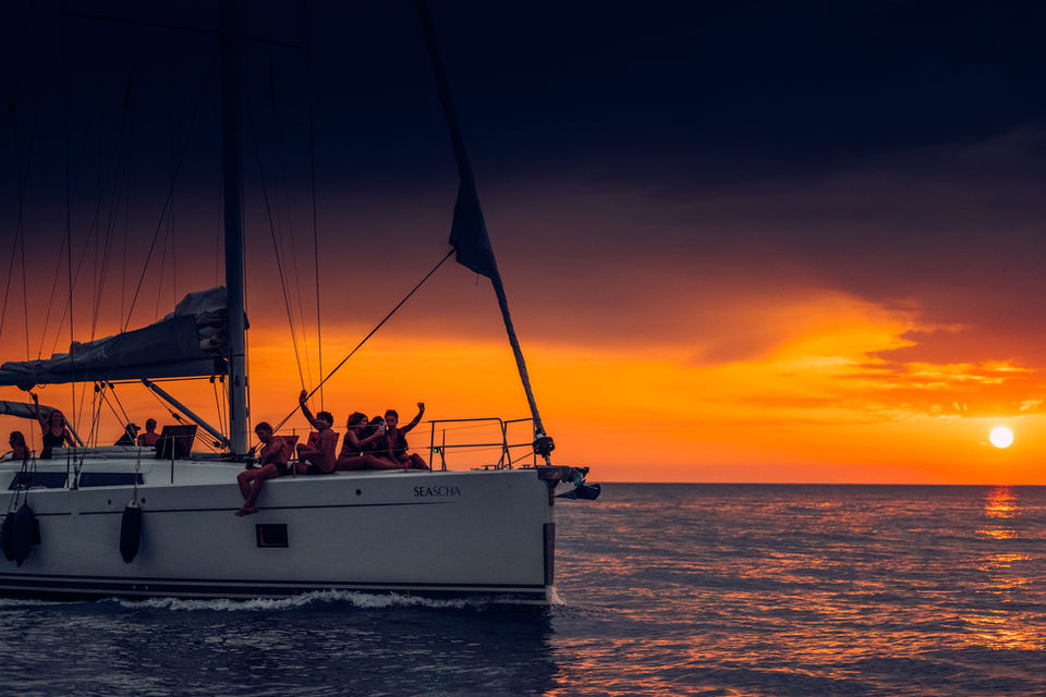 Join us for an unforgettable evening on the water — cruise into golden hour, sip champagne on deck, take a refreshing swim, or simply watch the sky shift from brilliant blue to radiant pinks and oranges as the sun sets.